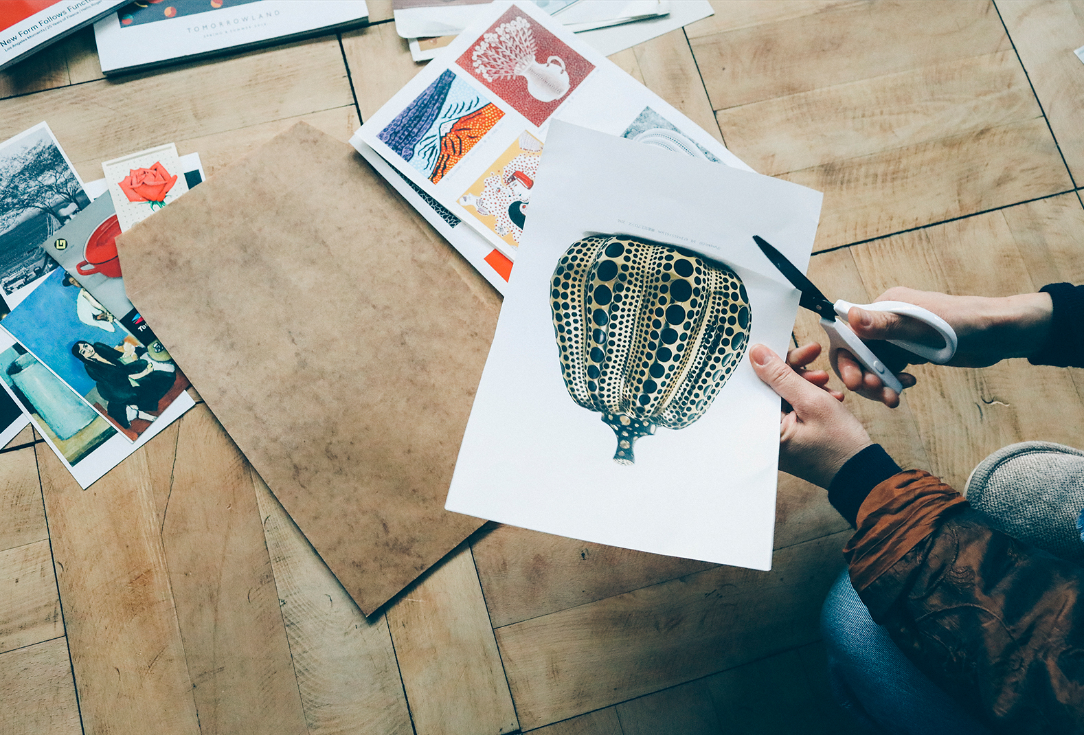 材料は、美術館で買ったポストカードやショップに置いてあるフリーペーパー、映画のリーフレットなど。