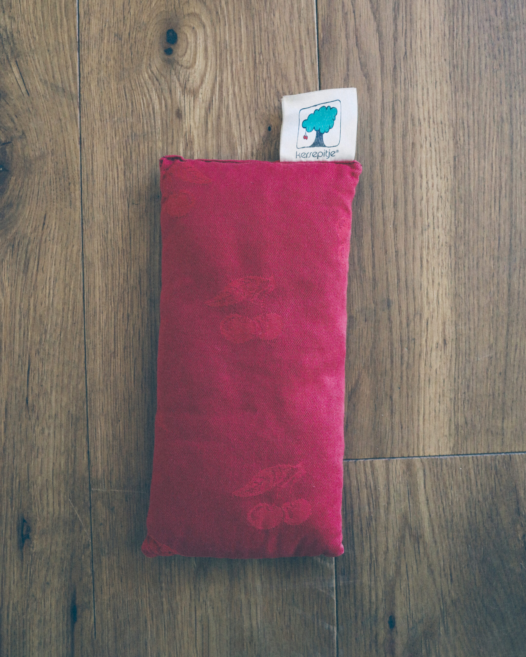 温冷どちらにも使える、kersepitje というブランドのサクランボの種が 入ったピロー。「レンジで1分半温 めるだけ。じんわり温まるので、おなかに乗せたり、寝る時に足の間に はさんで使っています」